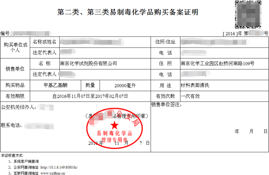 《易制毒化學品購買備案證明》由購買方到當地公安局或者網絡平臺自行辦理。所需銷售方提供的資料向銷售業務員索取。