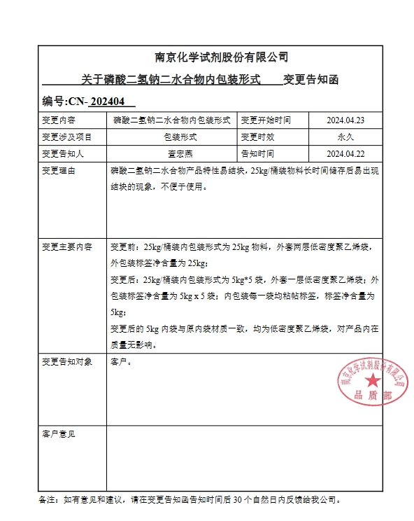 南京化學試劑股份有限公司:關于磷酸二氫鈉二水合物內包裝形式變更告知函編號:CN- 202404變更內容:磷酸二氫鈉二水合物內包裝形式變更開始時間:2024.04.23變更時效:永久