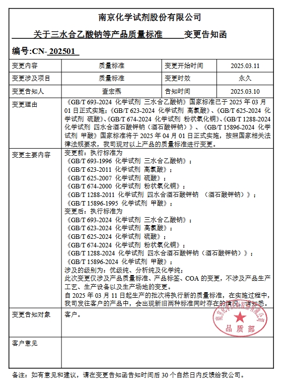 化學試劑三水合乙酸鈉、高氯酸、硫酸、粉狀氧化銅、四水合酒石酸鉀鈉、甲酸等六個產品質量標準更新,此次變更涉及的級別有優級純純、分析純和化學純,實施過程中會出現兩種標準號的產品!變更日期2025年03月11日,詳情如下: