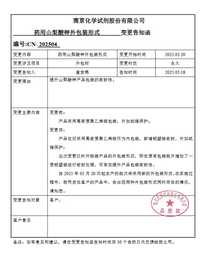 為提高產(chǎn)品包裝密封性,2025.03.20,對藥用山梨酸鉀瓶裝包裝形式進行變更,在原包裝瓶外增加鋁塑袋進行密封,變更告知函請注意查收,詳情如下:
